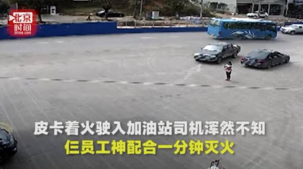 19日,广西贺州一加油站内忽然来了一辆冒着黑烟的皮卡,三名加油员反应迅速,灭火的灭火,拉电闸的拉电闸,一分钟扑灭了明火。加油站老板说,司机师傅都不知道自己车着火了,幸好员工反应迅速,不然后果不堪设想。
