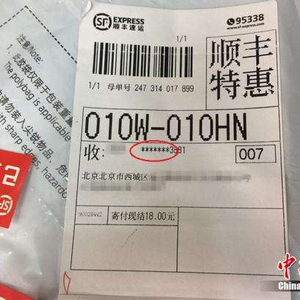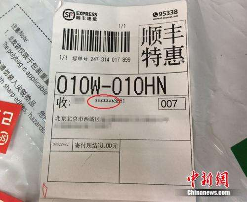↑顺丰的一张快递单上,收件人手机号码被部分隐藏。邱宇 摄