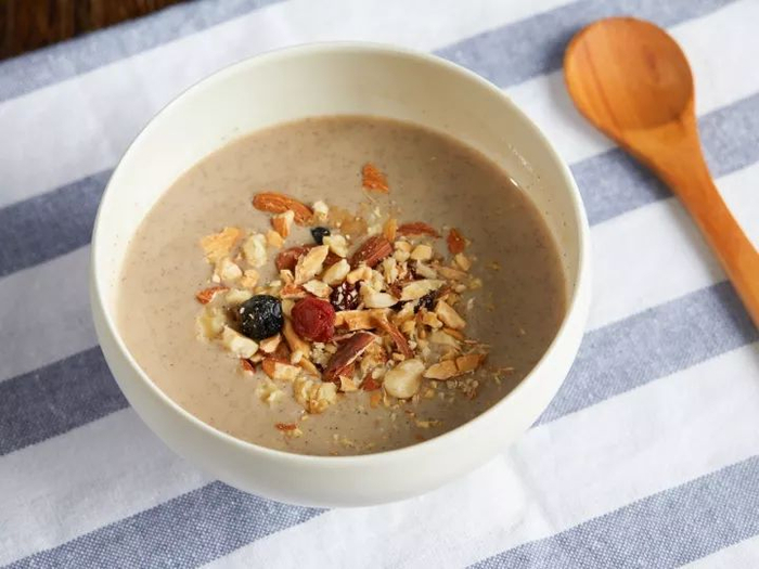来不及吃早餐的时候,泡1~2包薏米粉,撒上一些坚果、果干,就可以吃了。