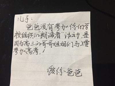 “眼泪在打转。”在妻子看来,这是他们相识以来少有的场景,张君站在客厅,包还没放下,像在看一部长篇小说似的久久盯着纸条。妻子提醒他赶紧去洗漱,张君放下纸条,不过没回房,而是转头摸到一支笔,给儿子回了句:“儿子,爸爸有你真好。”