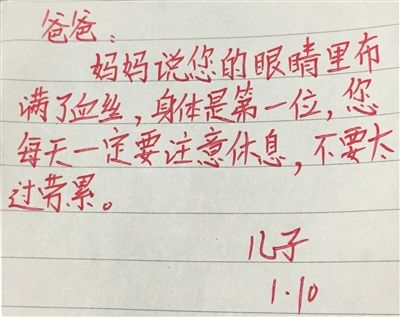 那天,当他处理完所有学生事务回到家时,茶几上放着的这张小纸片让张君产生了想哭的冲动。儿子用端正的楷书写道:“爸爸:妈妈说您的眼睛里布满了血丝,身体是第一位,您每天一定要注意休息,不要太过劳累。”