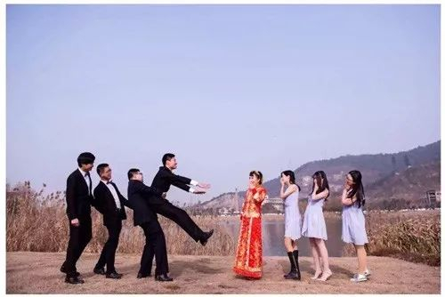 比如,一般新郎想见到新娘,要做五个俯卧撑,挑最胖的一个伴郎坐在新郎身上,做一个,说一句情话。