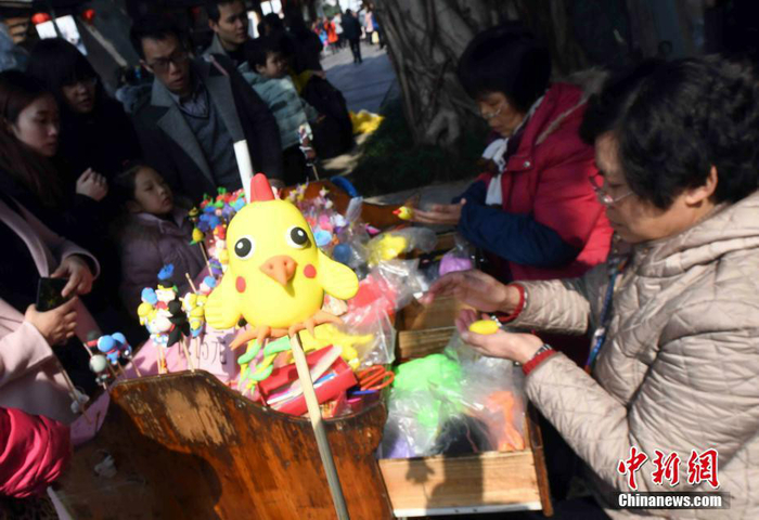 2月11日,中国传统元宵佳节。全国历史文化名街——福州三坊七巷传统花灯制作展示,郎官巷天后宫手绘面具体验,民间艺人现场制作糖画、捏泥人等丰富多彩的民俗活动,吸引众多市民前来体验,闹元宵。图为民间艺人在福州三坊七巷现场制作糖画引围观。刘可耕 摄