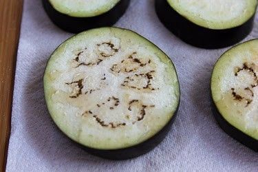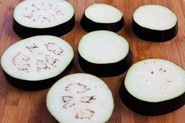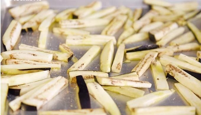 5.用吸油纸吸干茄子表面的水分,然后在茄子上刷一小层油(也可以不刷),然后码在盘子上。