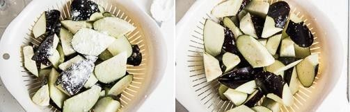 茄子带皮切,切成小块,然后撒入少许盐进行腌制,排出茄子里的水分。腌制10分钟左右时,可以用手攥一下,排出茄子里的水,更容易熟也更容易入味。
