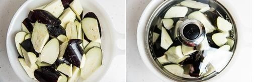 6.在茄子上放厚厚一层炒过的西红柿,然后放入微波炉,大火加热5分钟。