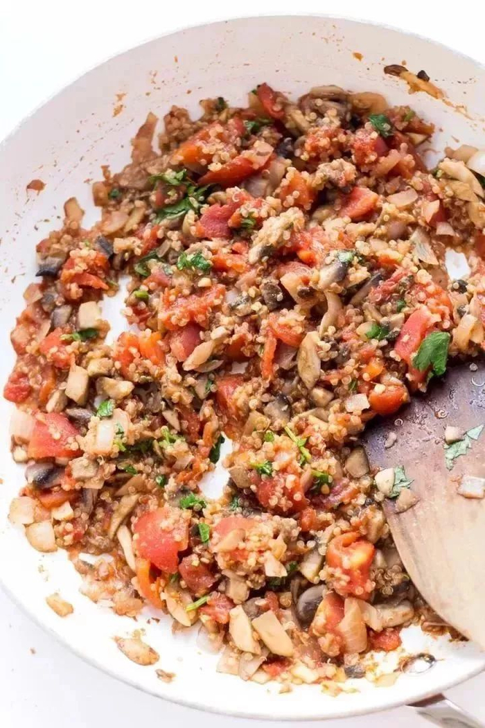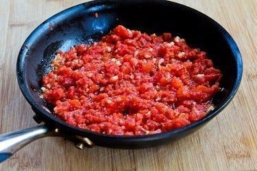 4.然后加入切成碎末的西红柿,继续煸炒。