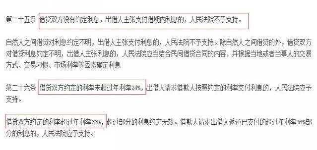 焦律师:根据《中华人民共和国民法通则》、《合同法》以及《最高人民法院关于审理民间借贷纠纷的司法解释》,民间借贷的利息不能超过24%的,超过24%到36%的部分,是属于效力待定的,超过36%的部分,那就属于不受法律保障了。