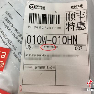 顺丰的一张快递单上,收件人手机号码被部分隐藏。中新网 邱宇 摄