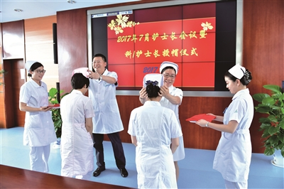 医院充分认识到要想拥有一支优秀的护理队伍,必须首先建立一支优秀的护理管理队伍。为此,医院着力加强护理管理队伍建设。护士长工作在医院管理中起着重要作用,为培养 “有为才有位”的意识,强化护士长不断进取的工作态度,医院采用竞争激励机制,实行护士长聘任上岗,使一批优秀护理管理人才走上护理管理岗位。医院还加强护士长后备干部队伍建设,优化护理干部队伍结构,形成护理干部队伍的良好梯队。在2013年、2016年,医院分别选拔出10名、20名护士长后备干部,目前已有10名护理后备干部被提拔为护士长及以上岗位,其余17名后备干部在培养期。