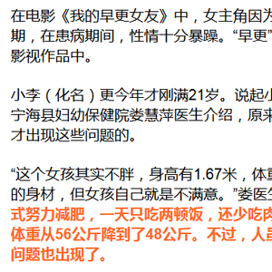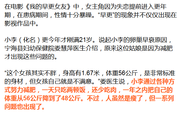 经过检查,小李是因为过度减肥致使营养缺乏,导致卵巢功能早衰,使得绝经期提前。如果不尽早治疗,不但正常的月经周期不能恢复,以后的生育也会受影响。小李表示今后再也不敢乱减肥了。