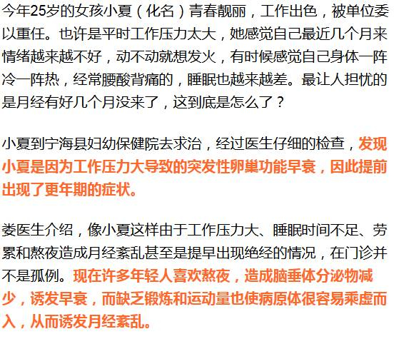 “过去一年,20~25岁就出现更年期症状患者统计下来有8个,应该引起重视。”娄慧萍说,由于激烈的社会竞争和巨大的工作、生活压力,门诊还常遇到35~40岁就绝经的女性患者。