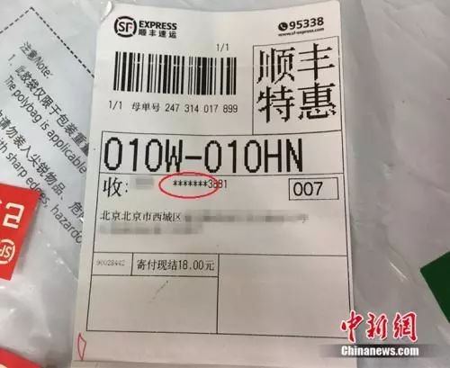 顺丰的一张快递单上,收件人手机号码被部分隐藏。中新网 邱宇 摄