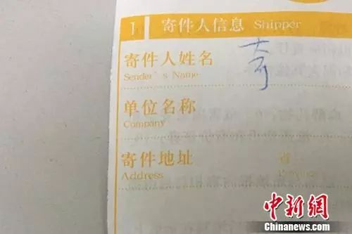 快递单寄件人没有实名填写。中新网 汤琪 摄