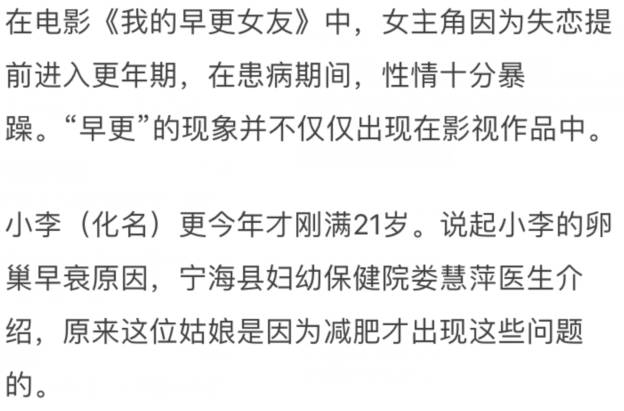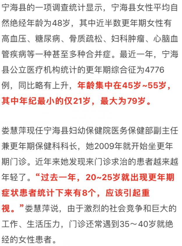 更年期症状只会出现在中年女性身上?最近,来自宁波宁海县的一项调查显示,女性更年期有年轻化的趋势,过去一年,就有8位20多岁的女生,因为种种原因导致卵巢早衰,从而提前出现更年期的症状。
