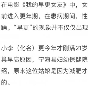 经过检查,小李是因为过度减肥致使营养缺乏,导致卵巢功能早衰,使得绝经期提前。如果不尽早治疗,不但正常的月经周期不能恢复,以后的生育也会受影响。小李表示今后再也不敢乱减肥了。