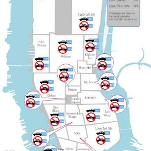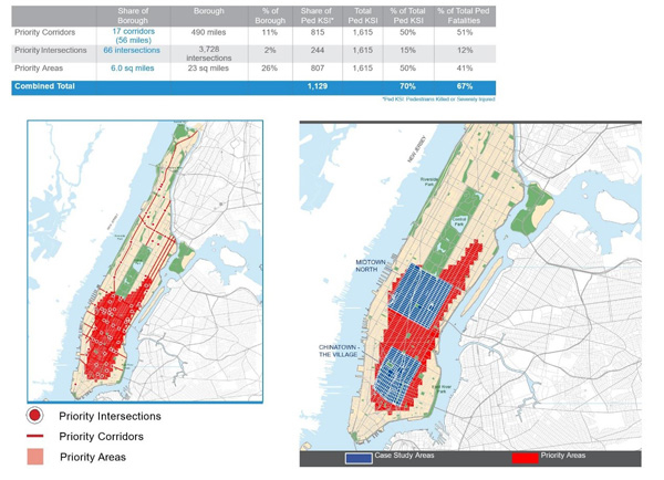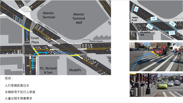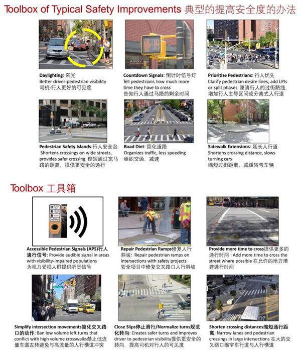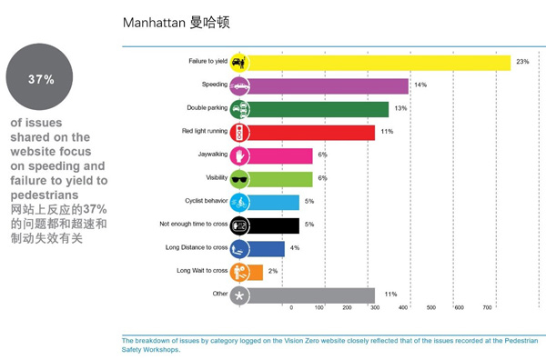 纽约是美国人口最为稠密的城市,根据2016年统计,人口约为850万人,平均每平方公里1.08万人。作为中心区的曼哈顿人口密度则达到每平方公里2.73万人。在工作日期间,纽约往来曼哈顿的通勤人口使该区密度达到6.56万人每平方公里。 庞大的通勤需求考验着纽约的城市治理能力。当1811年著名的“commissioners Plan of 1811”被采用时,就奠定了曼哈顿岛横平竖直的方格网道路结构。而此时,纽约的地面交通还处于马车的时代。直到1904年时任纽约市长乔治·麦克莱兰手握操纵杆,开通纽约的第一条位于曼哈顿岛的9.1公里长的地铁线时,小汽车还未进入流水线大量生产。60mX240m尺度的街区地块划分,遵循经济效益的最大化原则,适宜尺度加上沿街面商铺,为步行友好的城市发展奠定了极为良好的基础。 今天,纽约以地铁为首的公共交通保障了大量的人流通勤高效运转,而路面上的小汽车则被严格限制。据2015年统计数据,46%的纽约居民拥有小汽车,而在曼哈顿岛汽车拥有量更低,数量最高的区域也仅为28%的汽车拥有量。 曼哈顿小汽车拥有量的社区分布图,资料来源:https://www.addressreport.com/blog/manhattan-neighborhoods-with-the-most-cars/ 在曼哈顿岛下城与中城,地铁站点分布密集。加上地铁不是以各线路封闭路径,而以不同车次结合快慢车运行,使地铁的停站效率兼顾了地面公交的优点。在强大的公共交通系统支持下,纽约通过限速、转弯限制、方向限制等一系列措施,提高小汽车进入曼哈顿岛的门槛,使行人更倾向公共交通。居住在曼哈顿岛的就业人口采用小汽车通勤的仅占5%,而即便是曼哈顿岛以外的就业人口,采用汽车通勤的也仅占16%。与此同时,纽约不断在街道安全性和适宜步行方面做出努力。 “零事故愿景”(vision zero) 从2014年开始,纽约启动“零事故愿景”(vision zero),不再把交通事故看做“意外”,而是作为可预防事件来对待。实际上,虽然总体而言纽约的交通事故呈降低趋势,但2015年,曼哈顿岛平均每周有6个行人因交通事故死亡或者严重受伤。 曼哈顿交通事故分布数据图 “零事故愿景”通过多种渠道搜集交通事故数据,覆盖纽约五区。通过上图可以看到,以曼哈顿岛为例,交通事故高发的区域主要集中在下城与中城,根据数据分析,“零事故愿景”进一步确认了交通治理的重点,并进行了三个层级的分类:主要交叉口、主要街道和主要区域。 根据数据分析得出的交通治理重点分布图 所有的交通事故都被归纳出主要原因并进行占比统计,分为以下几大类:未能及时制动、超速、并排停车、闯红灯、乱穿马路、视线可见性、骑行人行为不当、穿越时间不足、穿越距离过长、穿越等待时间过长、其他。事故原因的分类为具体改进方案提供了依据和基础。在曼哈顿岛,37%的事故原因与制动不及时和超速有关,这也为限速管理提供了依据。 交通事故原因统计图 曼哈顿限速地图 通过上图可以看出,在2014年,曼哈顿岛上的限速管理几乎全部呈现南北纵向的格局。没有标明颜色的路网的限速均在40km/h。沿岛岸线允许机动车相对快速行驶,但仍遵循由北至南的减速状态。在限速改进后,内部格网的限速从48km/h降低至40km/h,中央公园内的车行道从40km/h降低至32km/h。曼哈顿的匀质路网通过限速、转弯限制、方向限制的管理,脱离了匀质空间格局,形成了新的潜在空间结构。这些限速边界形成新的空间中心,加强了场所边界的识别感。 从限速地图上可以看出,限速改善也增添了网格东西的横向联系和慢行区。慢行区是指一个完整区块内,车型道路均限速在32km/h内的区域。以2014年后新设立的曼哈顿西村(west village)的慢行区为例,数据表明,当车速限制从60km/h到32km/h时,事故的死亡率从70%下降至5%。限速的设计包括使用平缓的减速带、街区入口标识、路面标记。 限速设计的几种方式:街区入口标识(左图)、路面标记(中图)、平缓的减速带(右图) 针对特定人群的街道改造 在街道管理上纽约也重视结合不同区域的人口特征,比如2008年启动的专为老年人设计的街道安全计划(Safe Street for Seniors)。纽约面临老龄化的挑战,老年人(65岁以上人口)占城市人口的13%,而在交通伤亡事故中,老年人是年轻市民的4倍,占交通死亡率的39%。下图中的地图数据从65岁以上的行人伤亡集中的区域确立了治理范围。 根据65岁以上的行人伤亡集中的区域,确立了治理范围分布图。 而在事故的原因统计中,可以看出问题包括:穿过街道的时间不足、人行坡道破损、道路标志线褪色难以识别、人行横道排水不良或积水、转弯车辆不礼让。在设计改进中,针对具体问题进行提升。如下图中,皇后区的改造案例。 皇后区改造前后对比。 在改善街道安全性方面,基于代表性的问题分类,积累出了解决方案的工具箱。 提高安全度的工具箱 强大的跨部门协调能力 在数据搜集、分析、实施方面,纽约的街道治理依靠官方与民间的合力参与。以2015年“零事故愿景”为例,我们从参与官方机构及职责清单上可以看到,任务量并不轻松,其中有大量的协调工作和信息沟通的过程。 比如纽约市政厅(City Hall),由市长执行办公室建立长期的“零事故愿景”项目,并搜集纽约市民意见、建立网站、发布宣讲等。纽约警察局(New York Police Department)则负责治理危险粗暴的驾驶行为,加强执法力度、投放速度检测设备等。 纽约交通局(Department of Transportation)的任务是