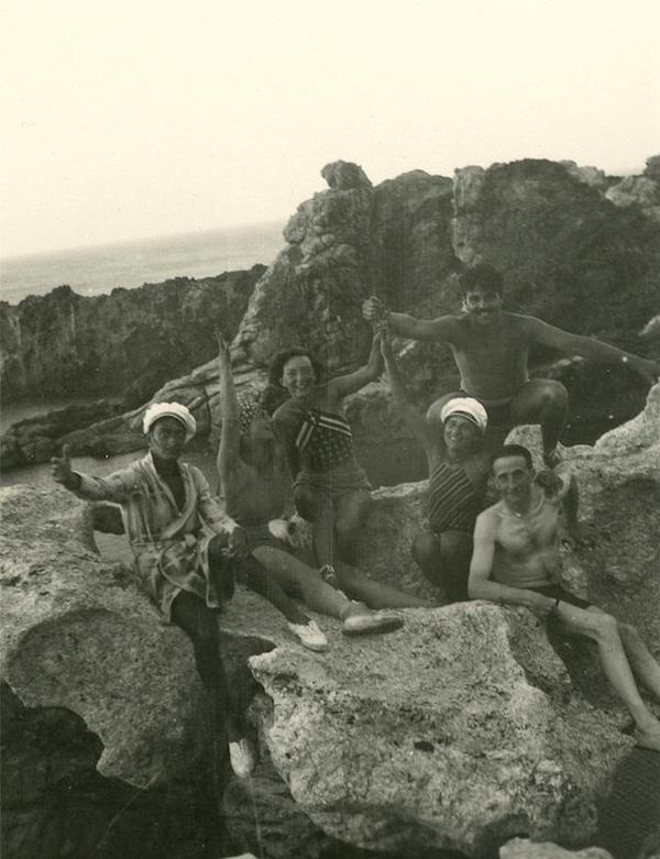 本次展览的联合策展人道恩·艾兹(Dawn Ades)观察到,性格相异的人反而互相吸引。1933年,相识三年后,杜尚和女伴Mary Reynolds来到西班牙的卡达克斯,不久就写明信片给好朋友曼·雷,催他速来会合:“天气特别棒,西班牙比塞塔也很有趣……达利和加拉也在,我们经常见面。”后来曼·雷加入他们,留下了这张照片: