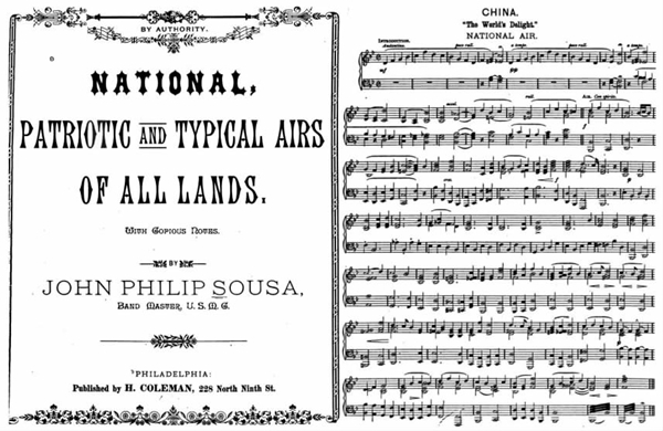 关于曲谱,现今发现的最早有关《普天乐》的西文文献是一则刊登在1882 年10 月1 日英国《音乐时报》(The Musical Times)上的出版信息。该消息的标题除提供了《普天乐》的拼音歌名(Poo Teёn Loh)、歌名的英译(The World's Delight)以及歌曲编配者的姓名——本聂狄克爵士(Sir Julius Benedic)及出版者名,不过没出现歌词和曲谱。幸运的是,1890年,美国著名军乐指挥和作曲家索萨(John Philip Sousa)在费城编辑、出版了一本《各国国歌、爱国歌及典型性乐曲大全》(National, Patriotic and Typical Airs of All Lands)。这本书不但收录了各国的国歌,而且有各国的代表性音乐。其中收录了两首中国曲子,一首是知名的《茉莉花》,另一首便是中国的National Air《The World's Delight》,即《普天乐》。