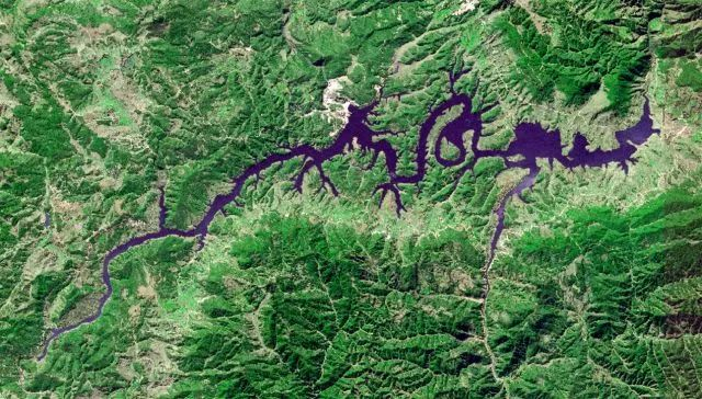 “飞龙在天”位于昆明市禄劝县的云龙水库,从遥感影像上看,水库细长且蜿蜒不断,正像是一条云间翱翔的巨龙。