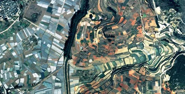 “抽象派油画”——寻甸小黄坡寻甸县地处云南省东北部,是滇东北之要冲。县境内地势西北高,东南低,呈向东南倾斜阶梯状。这幅色彩斑斓的影像正是这种倾斜的地貌与缠绕在山间的公路共同作用的结果,虽凌乱错落,但却不失美感,是一幅优秀的“艺术作品”。