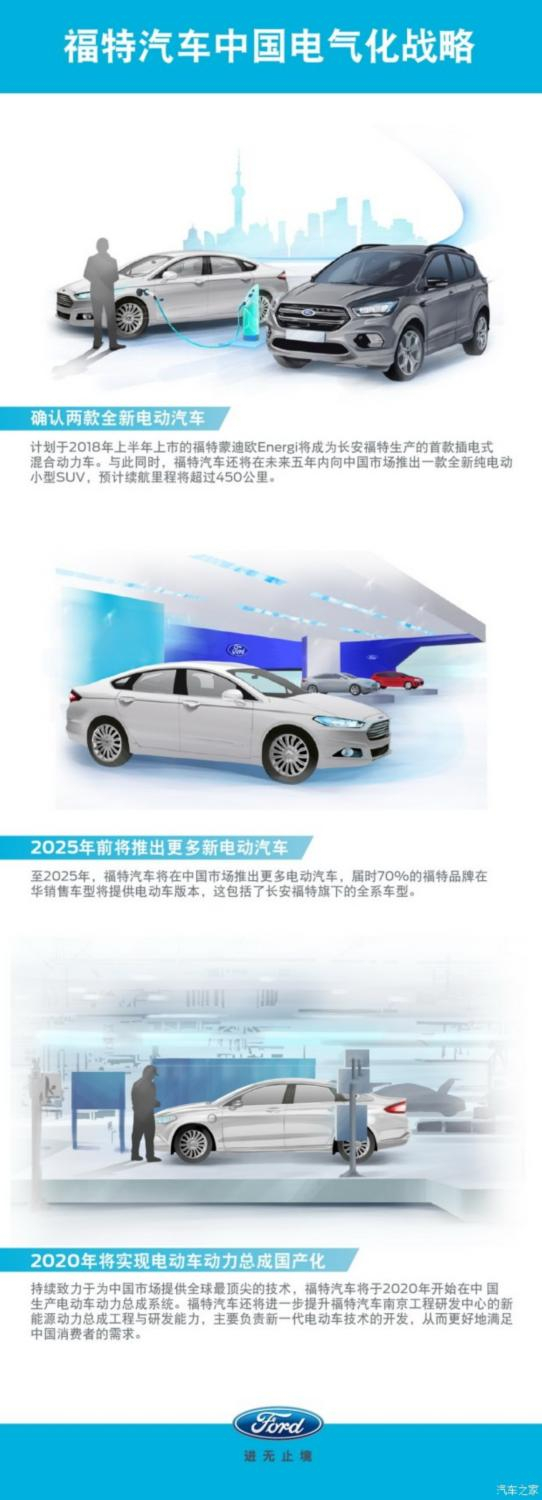 为更好满足中国消费者的多样化需求,尤其日益增长的电动车需求,福特汽车将在2025年以前为中国消费者提供全面的电气化解决方案——包括混合动力汽车、插电式混合动力汽车和纯电动汽车等不同形式的新能源车型。届时,70%的福特品牌在华销售车型将提供电动车版本,这包括了长安福特旗下的全系车型。