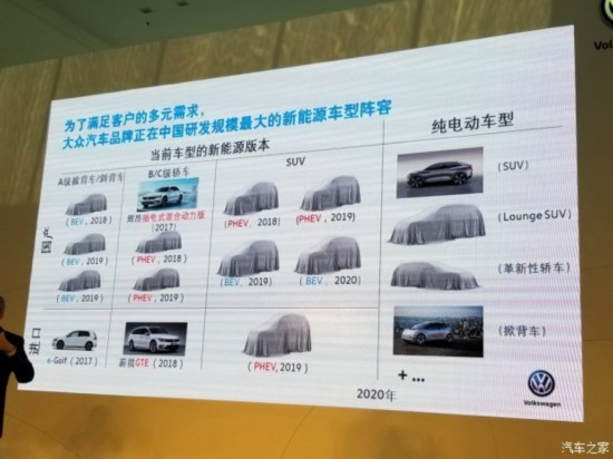 根据此前报道,未来大众将在中国市场上投放多款新能源车型,其中既包括现有车型的新能源版本,还包括全新的纯电动车型,总数多达17余款。