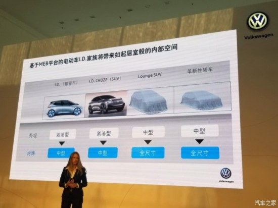 除此之外,大众还将在2020年后开始向中国市场投放基于全新MEB平台打造的4款全新纯电动汽车,分别为I.D、I.D.Crozz、Lounge SUV(或命名I.D.Lounge)以及一款革新性轿车(或命名I.D.AEROe)。其中I.D.以及I.D.Crozz两款概念车已相继亮相,I.D.为一款大小与高尔夫相当的纯电动掀背车,而I.D.Crozz为一款纯电动跨界紧凑型SUV。另外据了解,Lounge SUV将为一款纯电动中型SUV车型,而革新性轿车则定位在了中型纯电动轿车行列。未来这四款MEB平台打造的新车也将陆续进入中国市场。
