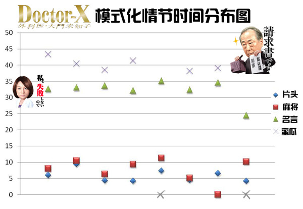 如果将今年十月中旬回归的《Doctor-X》第五季前两集与之前几季中时长六十分钟的集数相比较,也不难发现标签结构在出现时间点上具有一致性,《Doctor-X》的高度稳定性已经成为了它标志性的特征之一,这部剧之所以成功靠的就是高度模式化的结构设置。
