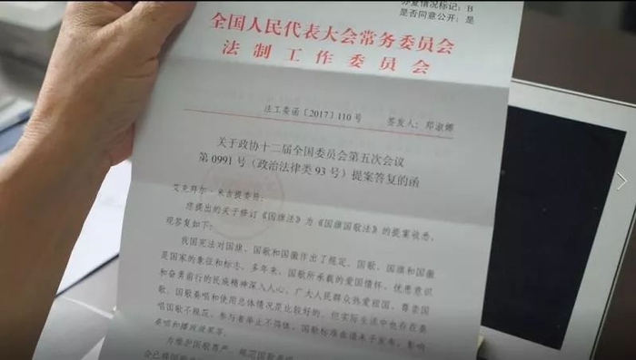今年6月,艾克拜尔惊喜地收到全国人大常委会法制工作委员会发给他的回复函,回复函中写道:“我国宪法对国歌、国旗和国徽作出了规定。国歌、国旗和国徽是国家的象征和标志,多年来,国歌所承载的爱国情怀、忧患意识和奋勇前行的民族精神深入人心……为维护国歌尊严,规范国歌奏唱、播放和使用,全国人大常委会已将国歌法纳入了2017年立法工作计划。今年6月,十二届人大常委会第二十八次会议对国歌法草案进行初次审议。”