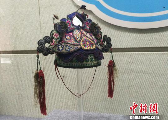图为展厅内的民国彩缎拼接莲花冠过桥戏装帽。 李庭耀 摄