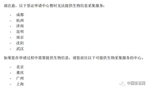 要注意,只有4个签证中心可以提供指纹采集服务:北京、重庆、广州、上海!(这无疑加大了申请人的成本和申请复杂程度)