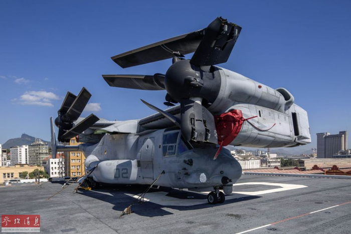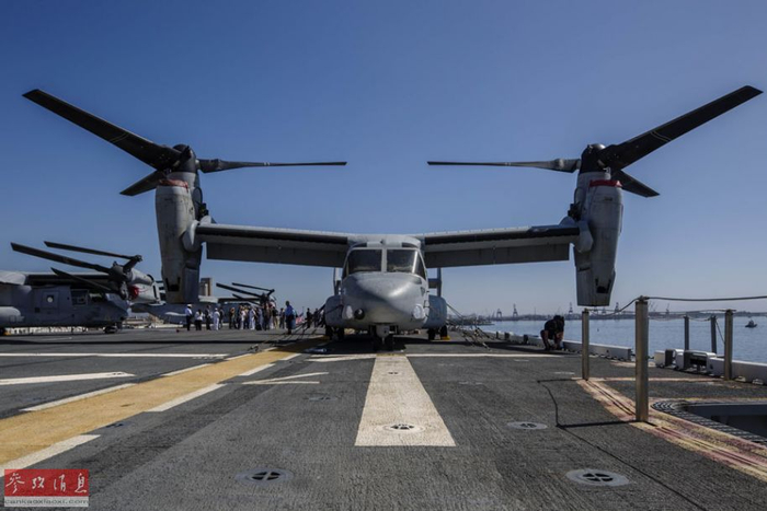 飞行甲板上还停有一架MV-22“鱼鹰”倾转旋翼机。