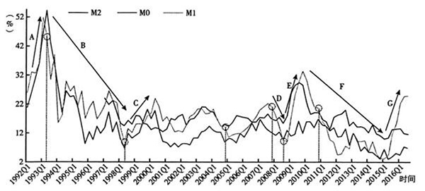 比如,图3中的A、C、E和G段,也即1992年至1993年第1季度之前,1998年第2季度至2000年前后、2009年第1季度至2010年第1季度以及2015年第1季度以来,为实现东南亚金融危机、次贷危机两次外部冲击以及经济新常态背景下的经济增长目标,中央银行通过增加各口径的货币投放数量予以支持;而1993年第1季度—1998年第2季度、2007第4季度—2009年第1季度以及2010第1季度—2015年第1季度,图3中的B、D和F段,面对通货膨胀压力高企,与经济“软着陆”、“双防”以及“稳物价”对应,中央银行采取了紧缩各口径货币供给的对策。