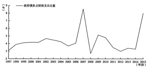 图7 1997年以来中国政府债务占同年政府支出比重变化