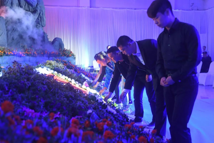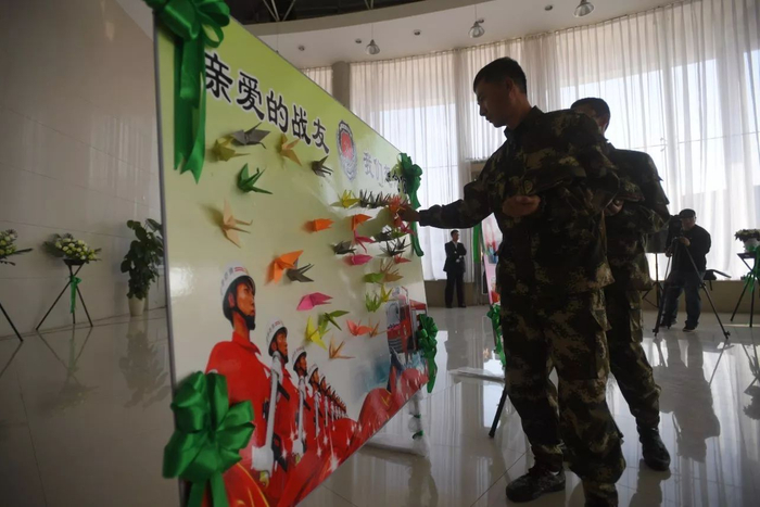 现场布置庄严肃穆,主持人用娓娓道来又饱含深情的声音,重现了那一场残酷的战斗;更用沙画的形式,别出心裁又充满温情地回顾了烈士短暂的一生。人们向一颗浴火雄心致敬,悼念永不磨灭的英灵,愿千纸鹤伴他飞翔,丰功载册,致敬不朽。