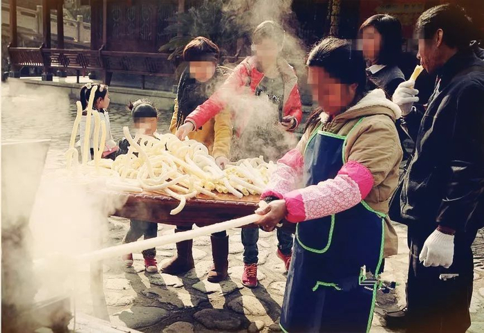 搅搅糖,这个一般是街边叫卖的零食,黄色糖浆在两根竹签之间搅来搅去,一股浓浓的苕香味便慢慢散开来,吃搅搅糖的乐趣便在于此。