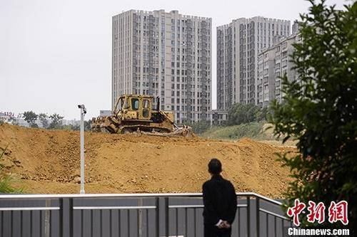 资料图:市民观望湖南长沙一楼盘工地上的推土机作业。中新社记者 杨华峰 摄
