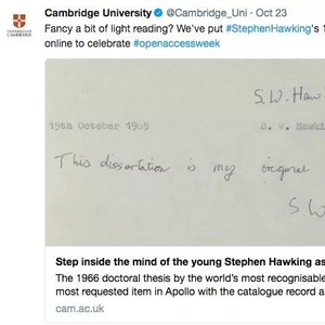 10月23日,为了纪念“开放存取日”,剑桥大学公开了霍金的博士论文。