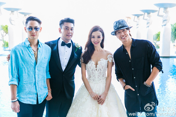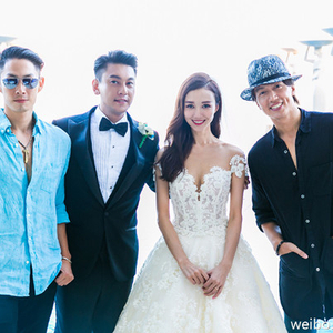 2016年朱孝天婚礼时,F4三缺一。左起:吴建豪、朱孝天夫妇、言承旭。