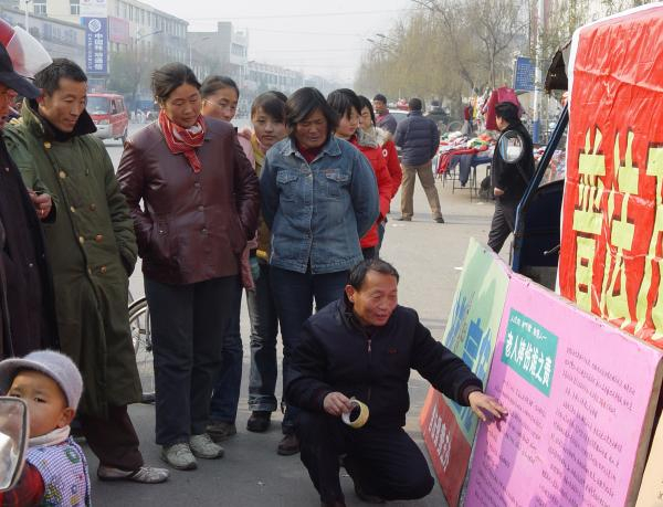 从上世纪八十年代中期开始,农闲时节每逢赶集,熊为义夫妇就拖着装有宣传牌的板车,到市场、学校、企业周边宣传法律。1995年离开乡计生办后,熊为义时间充裕,便开始跑邻近的集市和村庄。
