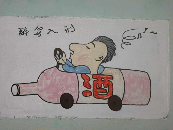 熊为义在路边画的“醉驾入刑”宣传漫画。沈梦雅 图