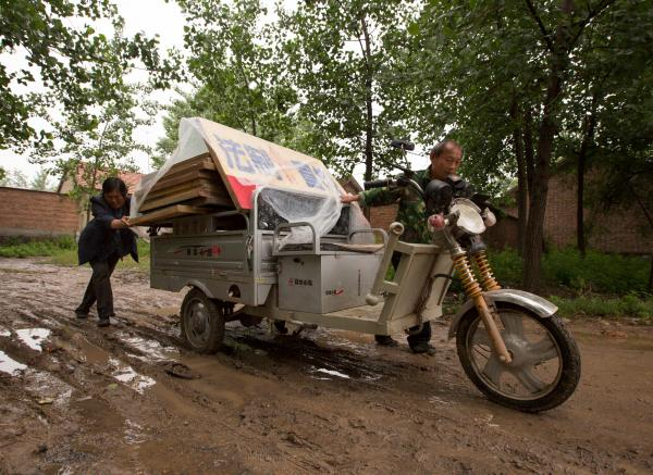 年复一年。蜿蜒的乡间小道,那辆颠簸的破旧板车——丈夫拉、妻子推,是许多当地人再熟悉不过的场景。