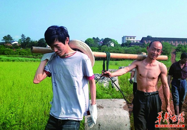 为了给村里建水渠,秦玥飞把花T恤反穿,跟村民一起下地干活。