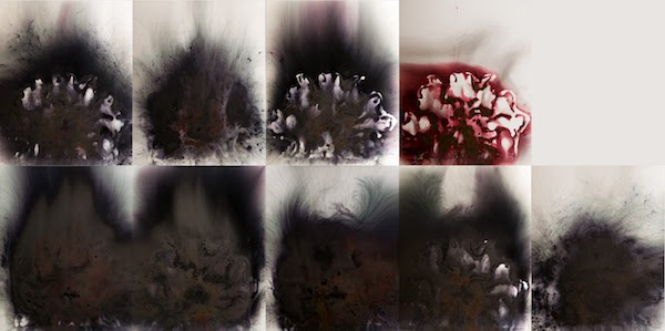 《黑色罂粟》九张画布依次减少黑色火药用量,直到释放出冷艳黑色下压抑的腥红,传递时间的变化。蔡解释:“绘画需要表现能量,这里是能量自己表现自己。”