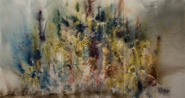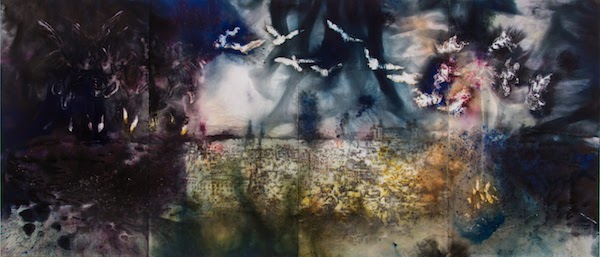 蔡国强:2009年,我带着女儿追寻格列柯的足迹,从格列柯的出生到死。因为从小受到格列柯的影响。今年初,为了普拉多的展览做准备,我再次回到托雷多。白天黑夜,通过窗子看出去的托雷多古城,那种时光交替,白天晚上混沌之间产生的许多看不见的精灵。这幅画是在万国大厅制作的第一张作品,也是为了联结小时候与格列柯的情感。