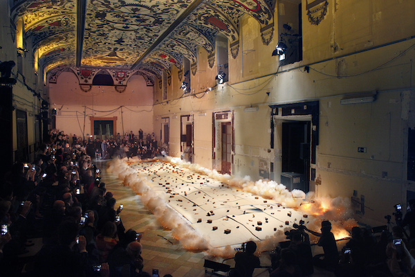 当地时间10月23日晚9点,艺术家蔡国强在西班牙马德里历史宫殿万国大厅引爆18米长火药绘画《绘画的精神》,也是他于10月25日在“普拉多美术馆”开幕的同名个展的压轴之作。