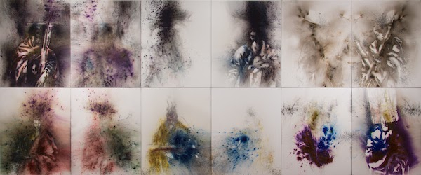 《画格列柯“使徒”系列之八、九、六、三、十、七》散发一种古典绘画特别的仪式感。每个使徒,都由平放的两块画布,一上一下压住之间的火药,爆破后形成一实一虚两件画作。下面更“实”,上面更抽象,“似乎灵性被移印出来”。
