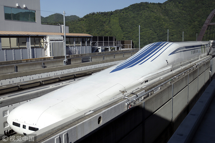 日本山梨县都留市,新型L0系列悬浮列车在山梨磁悬浮试验线上行驶 @视觉中国