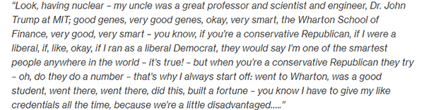 最经典的例子是特朗普在2016年7月的一段表述,他的话听上去更像是一种讽刺:“我的叔叔,是个了不起的教授、科学家和工程师,麻省理工的约翰·特朗普博士。基因好,非常好的基因,明白吗?非常聪明,沃顿商学院,非常好,非常聪明。你知道,如果你是保守派,我是自由派,如果,像是,明白吗?如果我以民主党身份参选,人们会说,我是世界上最聪明的人之一。真的是这样……”